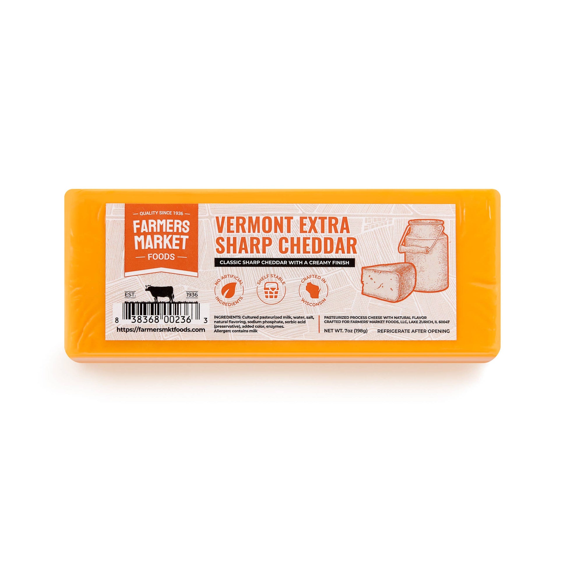 Grounded in generations of family farming and a passion for real food, Farmers Market Foods Extra Sharp Vermont Cheddar delivers bold flavor and timeless tradition. This 7oz block is artisan-crafted in Wisconsin with time-honored methods, bringing you the rich, tangy bite of authentic extra sharp cheddar. Perfect for gatherings, gifting, or elevating any charcuterie board.